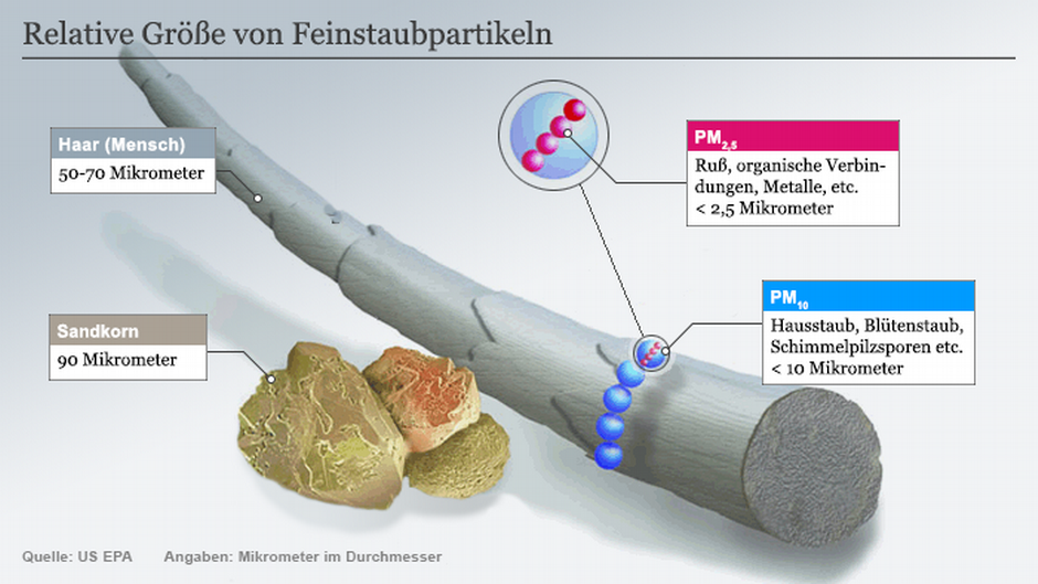 - Umweltbundesamt (2018): Was ist Feinstaub?Feinstaub gehört zum Schwebstaub. Als Schwebstaub oder englisch Particulate Matter (PM) bezeichnet man Teilchen, die nicht sofort absinken, sondern eine gewisse Zeit in der Atmosphäre verbleiben. Feinstaub entsteht insbesondere beim Verbrennen von Öl, Gas, Kohle und Holz. Feinstaub kann jedoch auch natürlichen Ursprungs sein. Dazu zählen etwa Emissionen aus Waldbränden oder Bodenerosion. Abhängig von der sogenannten Korngröße dieser Staubpartikel wird der Schwebstaub unterteilt: Unter PM10 werden alle Staubpartikel gefasst, deren Durchmesser kleiner als 10 Mikrometer (das sind 10 Millionstel Meter). PM2,5 ist entsprechend kleiner und hat deshalb verheerende Auswirkungen auf die Atemwege sowie das Herz-Kreislauf-System.