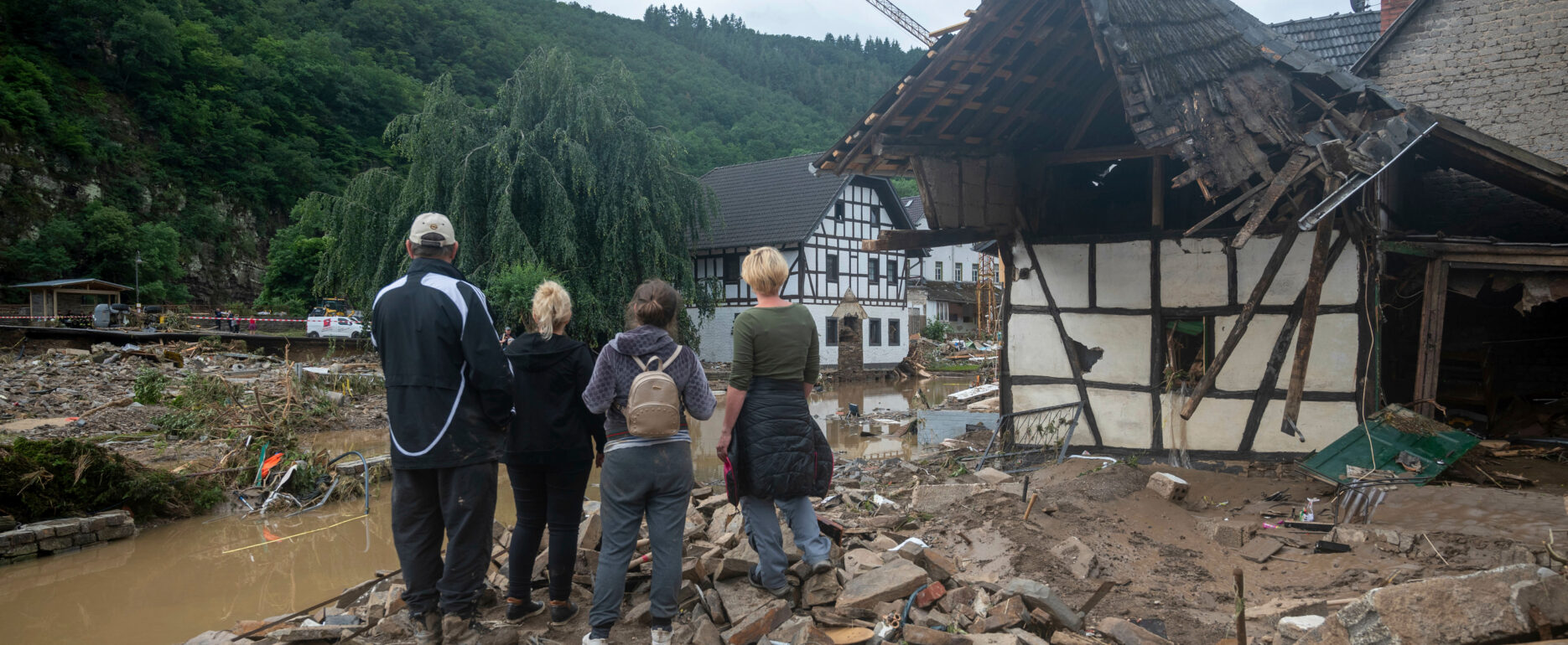 Foto: Menschen blicken auf die Zerstörung nach der Flutkatastrophe im Ahrtal © picture alliance/dpa/Harald Tittel